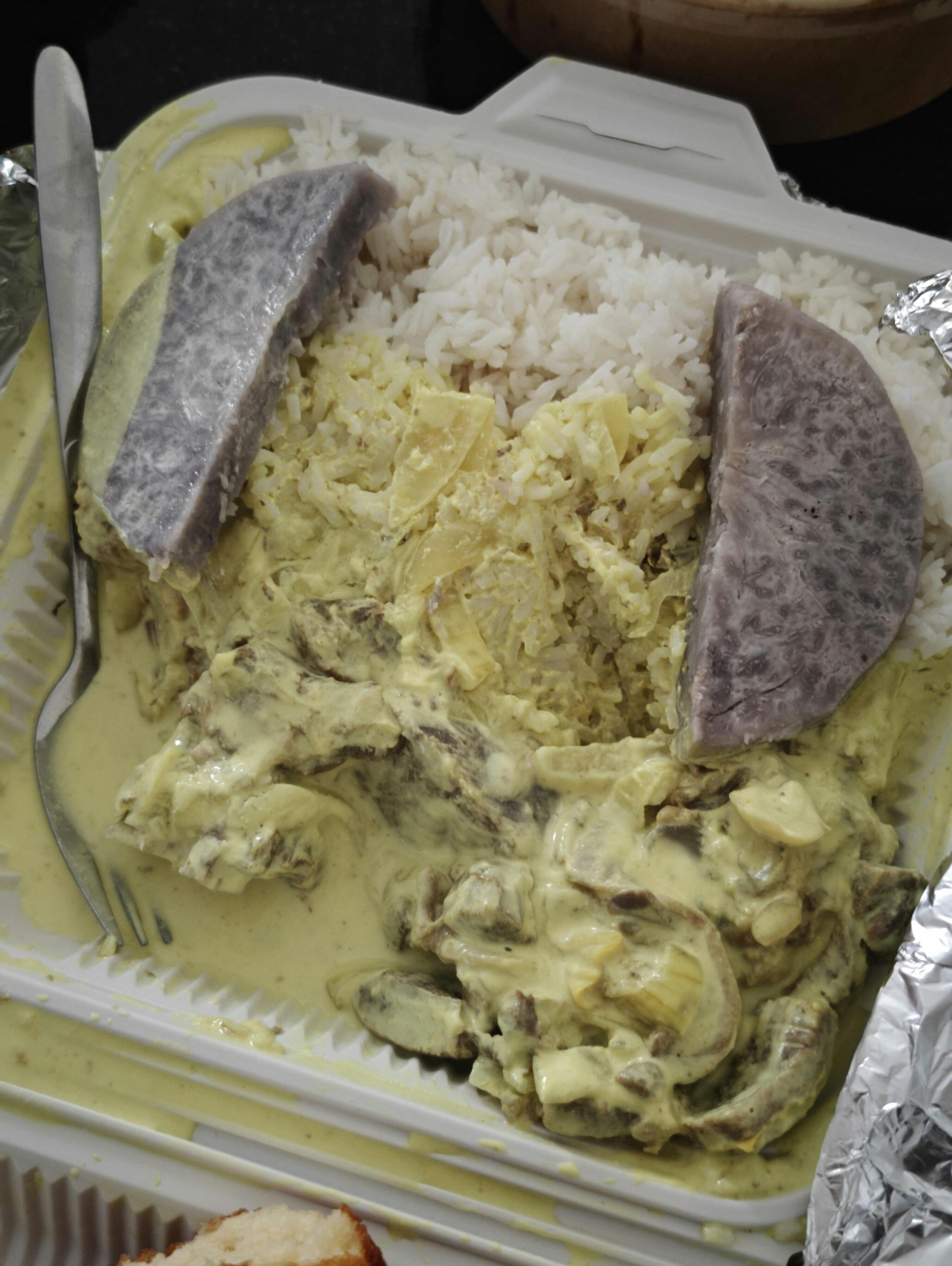 -Goat Meat in coconut sauce with cooked green bananas and rice.